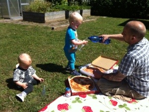 Vi åt första lunchen ihop ute i trädgården innan Peter fick lov att bege sig tillbaka till jobbet.