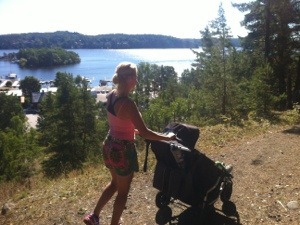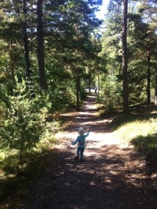 Barnen vaknade innan 6 imorse och ville inte ligga i sängen och mysa utan upp och leka. Efter lite (mycket) tjat, pappa pappa pappa pappa, mamma mamma mamma mamma… Masade vi oss upp. Vi åt frukost och sen ut på en morgonpromenad. Vi gick till motionsspåret och tog 5 km slingan. Åh va jag älskar Ekerö. Vilken fantastisk skog med fin utsikt, bra underlag och många slingor att välja på. Utomhusgym och en skog fylld med blåbär, smultron och svamp. Det blev en lång blåbärspaus efter 3 km.