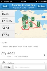 På kvällen tog jag en löprunda. Jag brukar alltid bestämma mig innan jag ger mig ut hur långt jag ska springa och vilken runda jag ska ta. Men idag ville jag känna efter lite hur kroppen kändes. Det stod 500m intervaller på schemat men det blev morgondagens pass 15 km istället. Det kändes bra. Jag tog det lugnt i början och ökade mot slutet. De sista två km gick i 4,10 min/km. Lyssnade på musik. Det brukar jag inte göra. Tycker oftast om att ta in omgivningen med alla sinnen men idag var det skönt att springa med hög, tuff musik i öronen 🙂 musik kan faktiskt göra så en tar i lite extra och orkar lite mer.