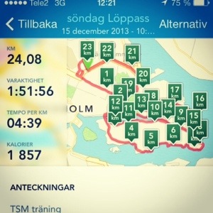 Det gick bra idag. Jag kände mig tung i kroppen den första milen men sen hade jag gärna ökat på lite med farten. Det är dock meningen att passet ska gå i lugnt tempo men det är svårt att hålla igen när det känns lätt.