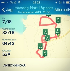Det var riktigt skönt ute, 7 plusgrader. Jag njuter av att kunna springa på bar asfalt. Det är ju så lätt mot att kämpa i snömodd och is. Löpmässigt är detta väder toppen men samtidigt är det lite trist att det inte finns snö. Den där julstämningen kan inte riktigt infinna sig hos mig i det här vädret.