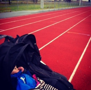 Efter lämning av Melvin och föräldrasamtal på förskolan tog jag en rask promenad med Elliot i vagnen. Han somnade nästan genast. Jag gick mot löpbanan för att köra långa intervaller. Det är lätt att springa på bana men trist att bara springa runt runt. En km kan ibland kännas som en evighet.
