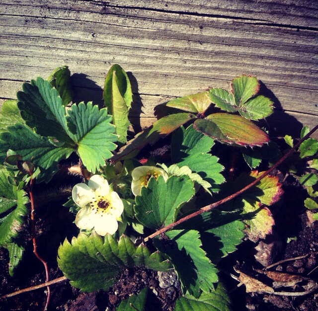 Idag har jag och barnen varit lediga. Det har varit en solig men ganska sval dag. Vi har påtat i trädgården. Titta, Jordgubbarna är på gång i rabatten.