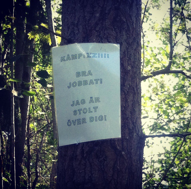Någon kåmpizz hade satt upp peppande meddelande längs motionsspåret.