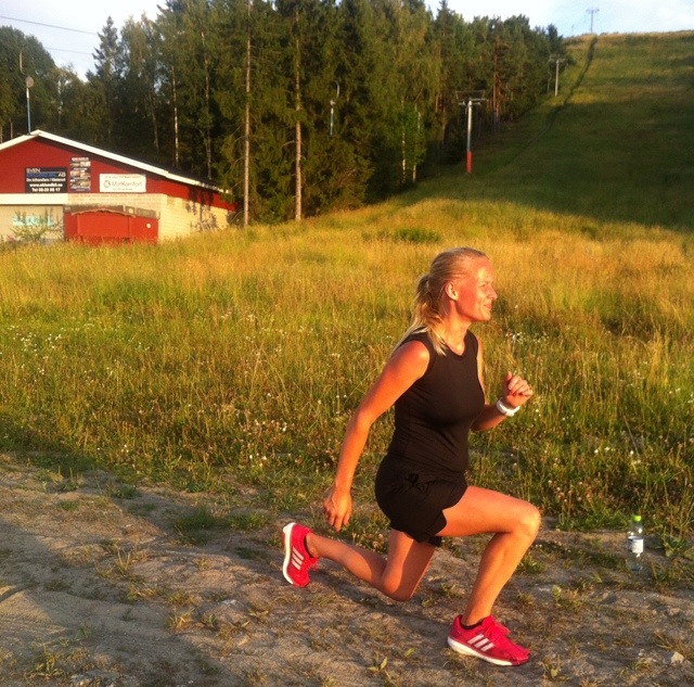 På kvällen mötte jag upp Sophia och Pär. Vi joggade till skidbacken där vi körde 4 * 45 sekunder upp för backen och 1300 m tröskel direkt efter backen med trötta ben. Gåvila tillbaka till backen och på’t igen. Tre omgångar. Gah! Vad det var tufft.