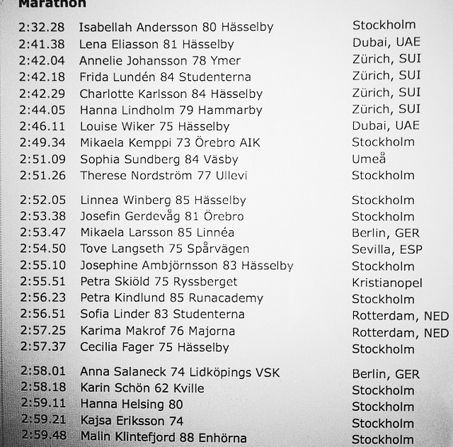 Såg den här listan från friidrottsförbundets hemsida. Jag har i år gjort den 23e bästa marathontiden bland de Svenska kvinnorna. Jag är extra glad att ha presterat med den tiden på Stockholm Marathon som räknas som en tuff bana i jämförelse med många andra lopp.